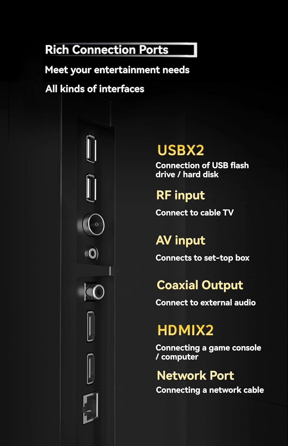 TV input interface(75Ω): 1 (IEC standard head)(Digital and analog integration, including DTMB function)